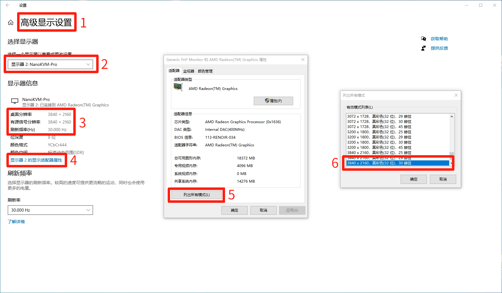 Settings→Display→Advanced Display Settings→ SelectNanoKVM-Prodisplay →Display Adapter Properties→List All Modes→ Choose the desired mode → Click Apply or OK.